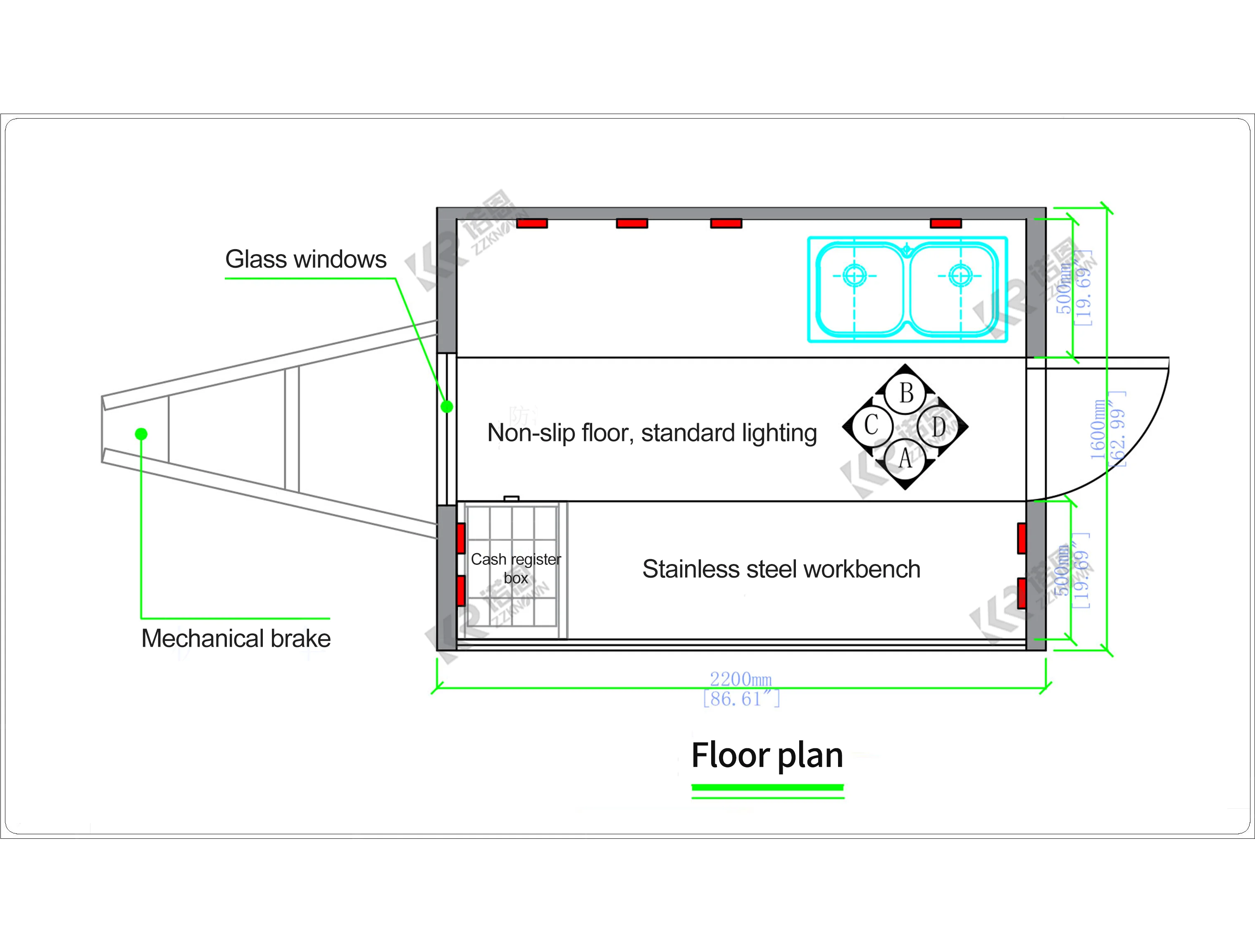 4 people can work together inside, commercial size kitchen equipment can be installed. |