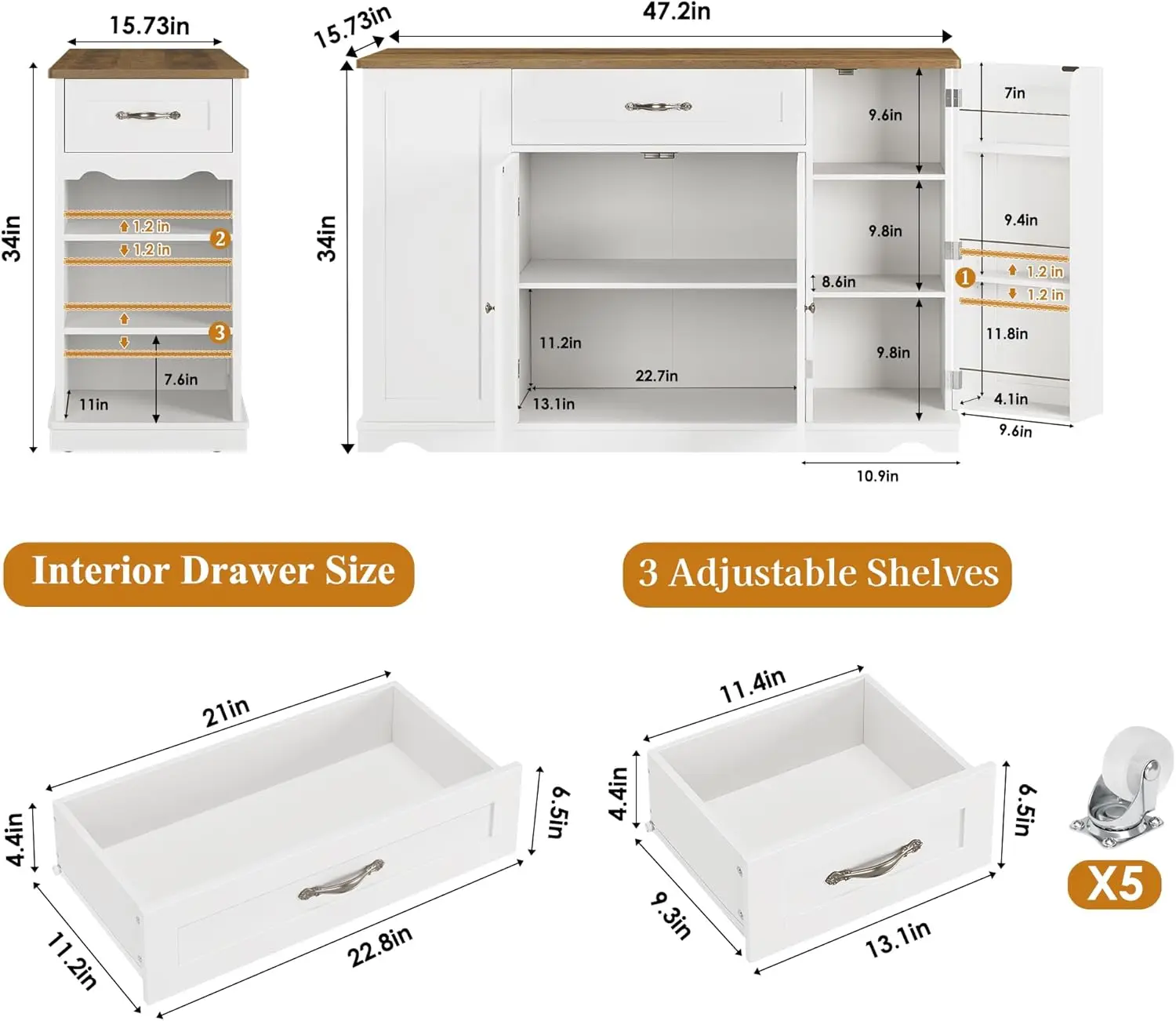 - ROBUST CONSTRUCTURE: With high-quality MDF and well-structured design providing wobble-free stability and durability, this island cabinet on wheels can withstand long-term use. Overall Size: 15.75"D x 47.24"W x 34.06"H