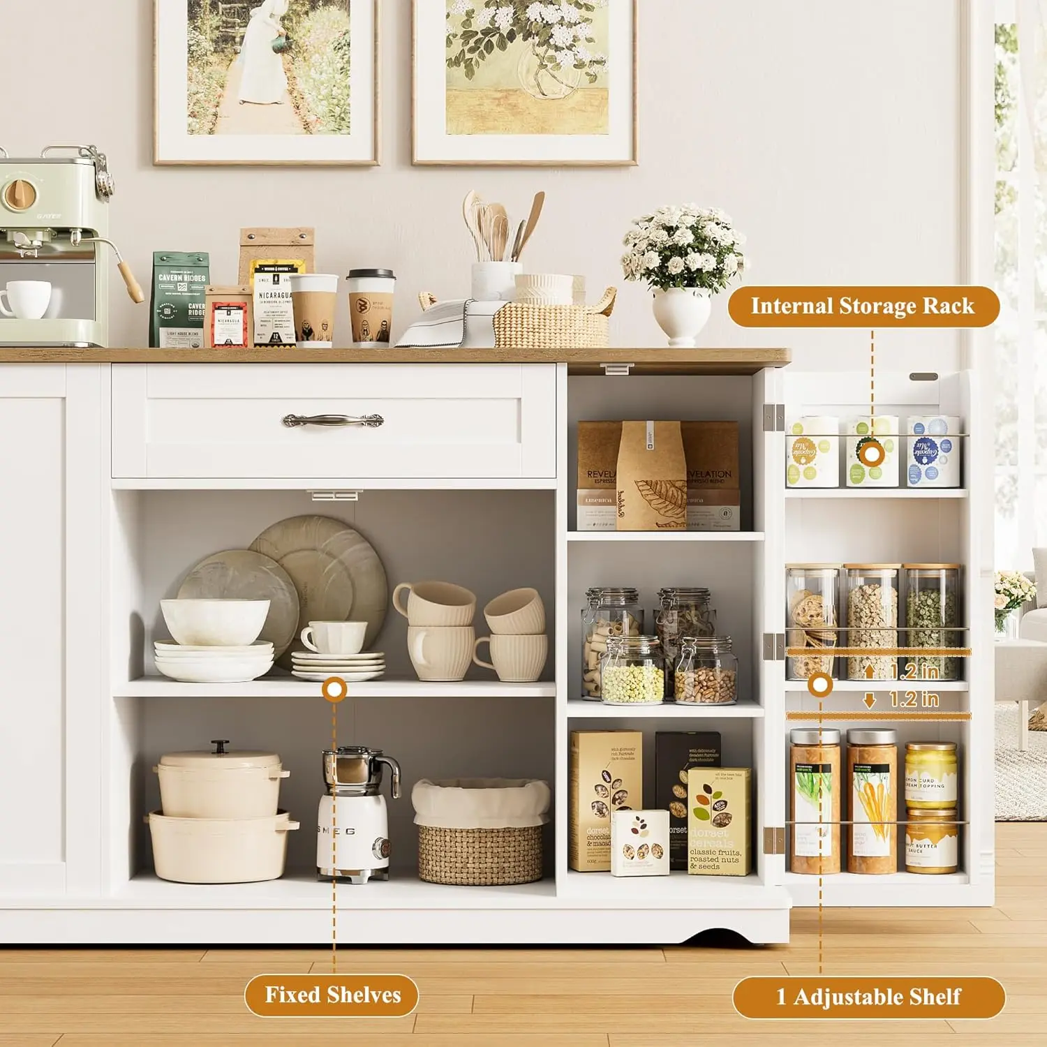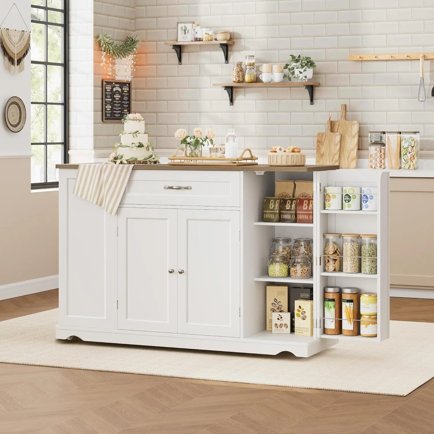 - ALL-IN-ONE SPACIOUS STORAGE: Corroborating two different-sized drawers for daily-used culinary tools like plates and silverware, a 3-door cabinet and a side storage rack for food, bottles, and jars, this kitchen island cart embraces the charm of accommodating all your kitchenware and make the most use of your space
